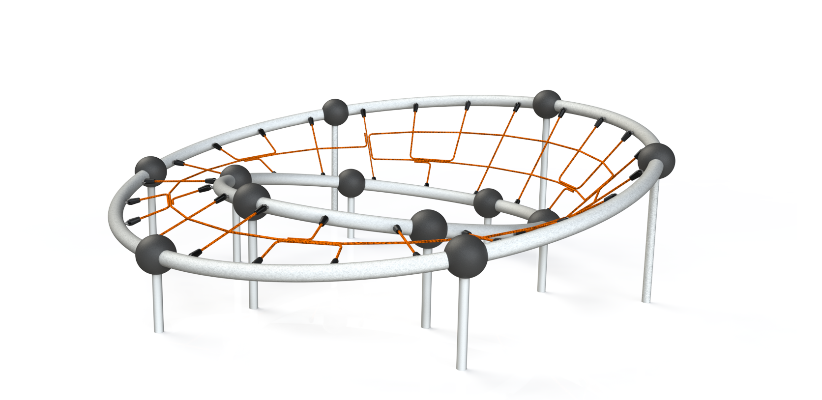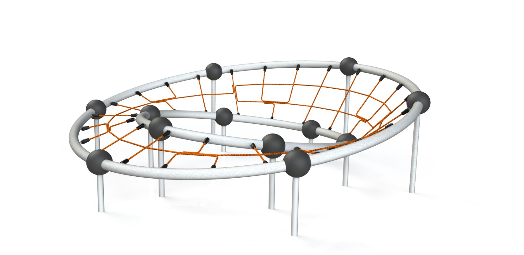 る遊具です。円とロープネットを基調として三次元的にねじれた形が子どもたちの好奇心を刺激し、あそびを創