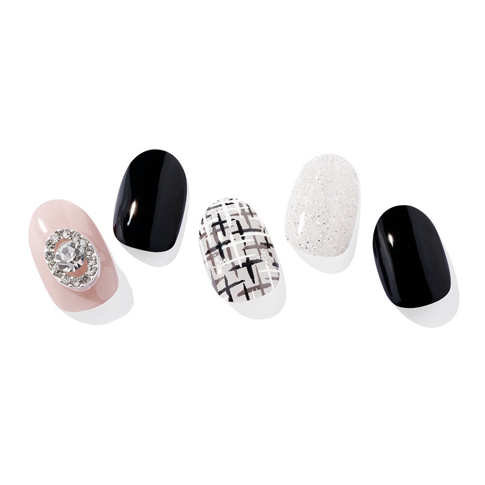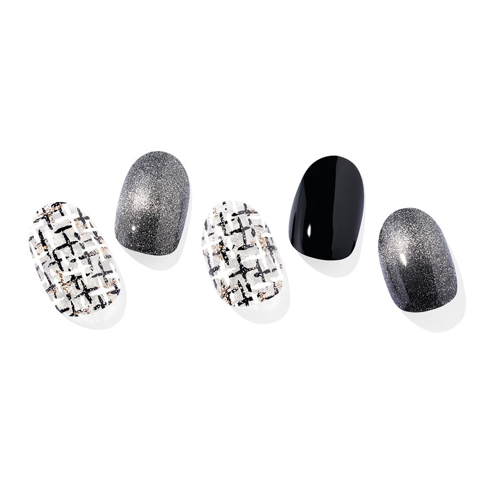 洗練さが際立つツイードブラックネイル。気品のあるツイードパターンのネイルと磁石で模様を描いたマグネットネイルがつくり出す、調和したブラックモードの世界。洗練さと高級感を印象づけ、指先の存在感を高めます。織ったように重なるツイードラインにグリッターの輝きをプラス。パーティーなど華やかなシーンにも映えるデザインです。