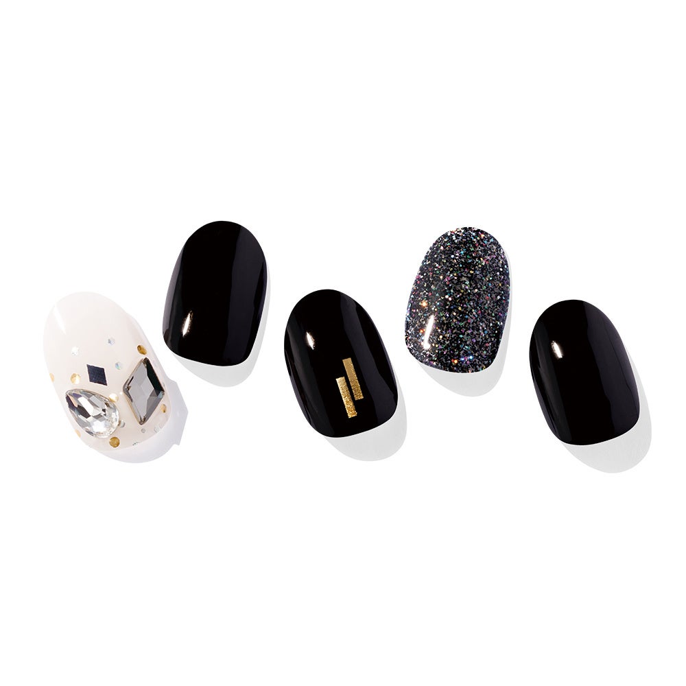誇り高き黒のプレミアムネイル フォーマルカラーの黒は、高級感や上質を感じさせる色。ツヤやな漆黒フルカラーにグリッター、金箔や銀箔、パーツをあしらったネイルを組み合わせることで、より華やかな雰囲気に。ジュエリーのように手元の品格を高めてくれます。