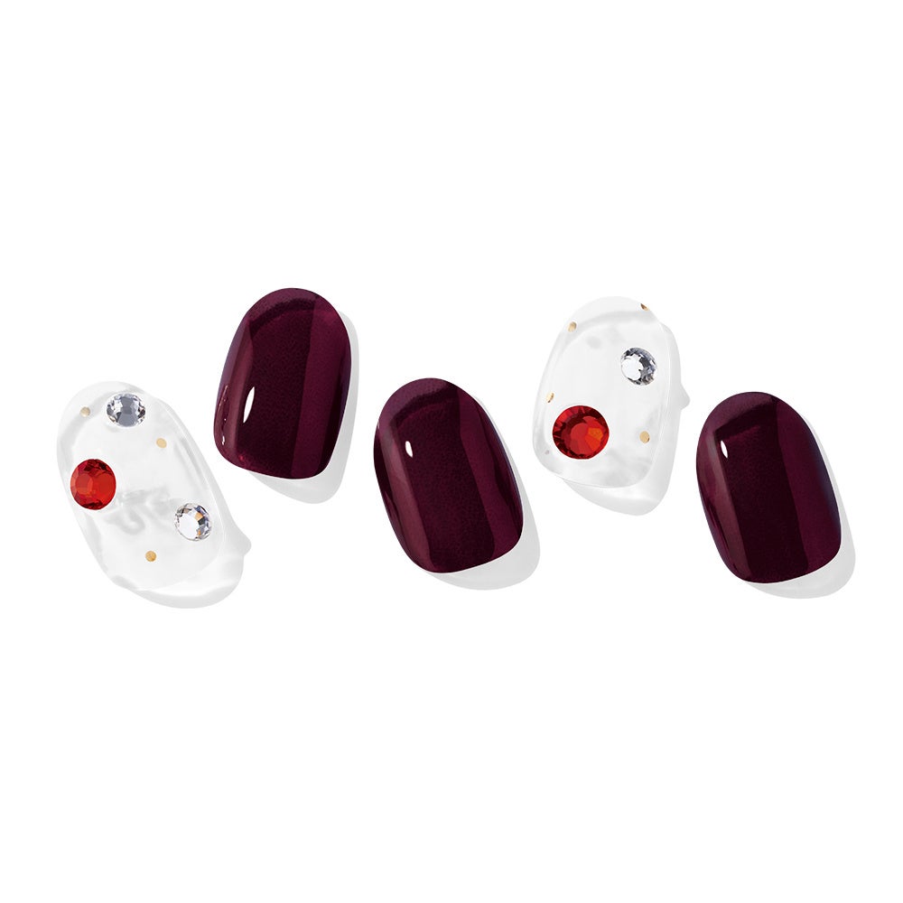 魅惑のバーガンディーネイル 深みのある赤みのバーガンディーは、手を美しく見せ高級感を感じさせる色です。1本だけクリアネイルに小さなラインストーンのパーツを合わせることで抜け感をつくり、大人の可愛らしさを表現。