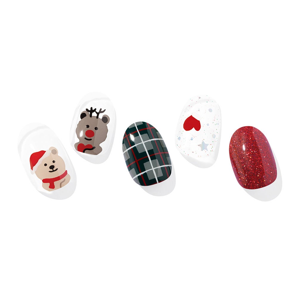 楽しい冬の物語を想像するクリスマスベアネイル。小さなネイルに描かれているのは、雪がこんこんと降る日に、プレゼントを配るサンタさんを助けるためにトナカイのルドルフとサンタさんに変身したくまちゃんの物語。厚手のショールのようなディープグリーンのタータンチェックネイルと華やかなグリッターの赤ネイルも加わり、クリスマスにぴったりのデザインです。