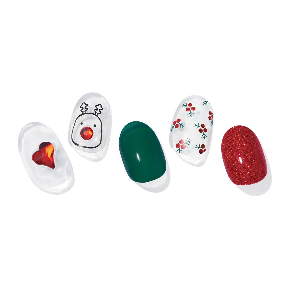 可愛いトナカイのウインターホリデーネイル 赤鼻のトナカイのルドルフをはじめ、キュートなクリスマスモチーフとカラーが目を引く冬ネイル。クリスマスホリデーのワクワク感をハートで表現したデザインに、冬のお出かけが楽しくなります。