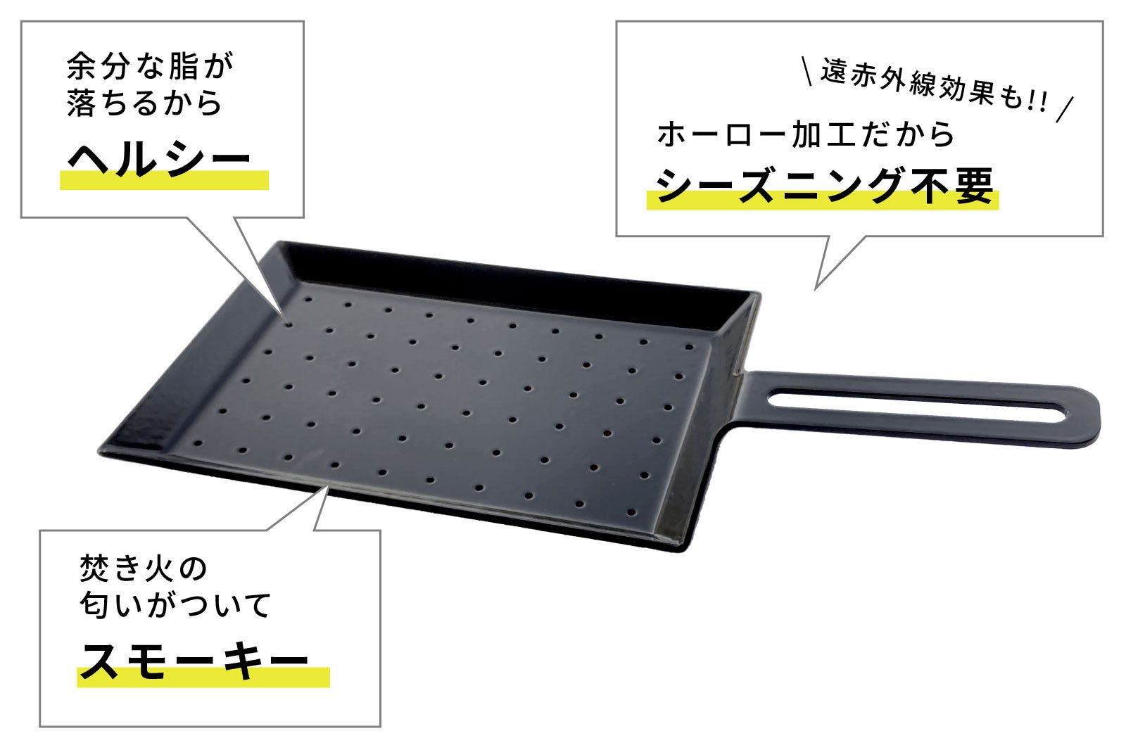 鉄板にあいた小さな穴が肉の余分な脂や水分を落とし、お肉をこんがり焼きます。