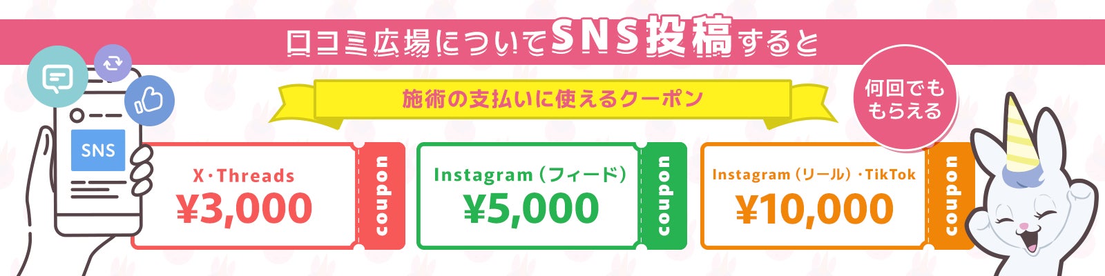 【美容医療の口コミ広場】20周年キャンペーン第3弾は「SNS投稿でもらえるお得なクーポン」です。