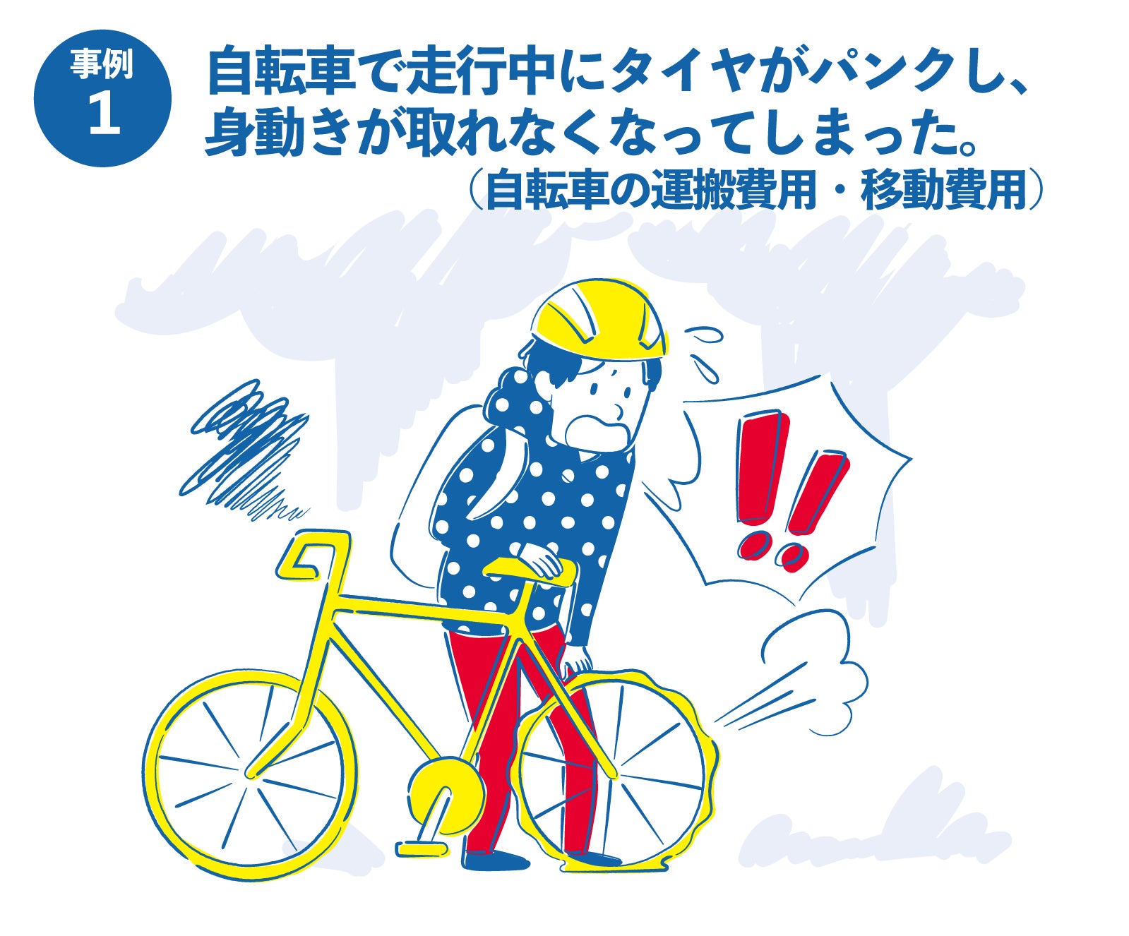 | 補償概要 | 交通乗用具(※3)に搭乗中の事故や歩行中の交通乗用具事故によりお客さまが被る ケガ、相手への損害賠償、弁護士費用、自転車等のレッカー費用、宿泊・移動費用を 補償します。 |