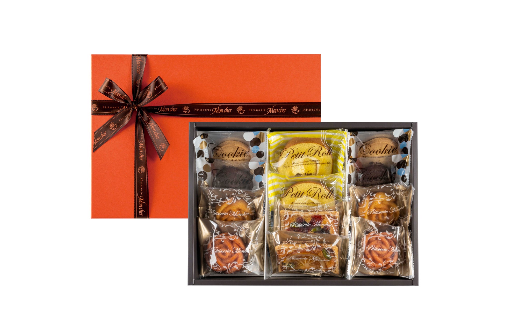 ぱっと目を引くほど鮮やかなオレンジ色のボックスとブラウンのリボンは、モンシェールを象徴するパッケージです。中にはシェフがこだわって焼き上げた自信作ばかりを詰め合わせました。