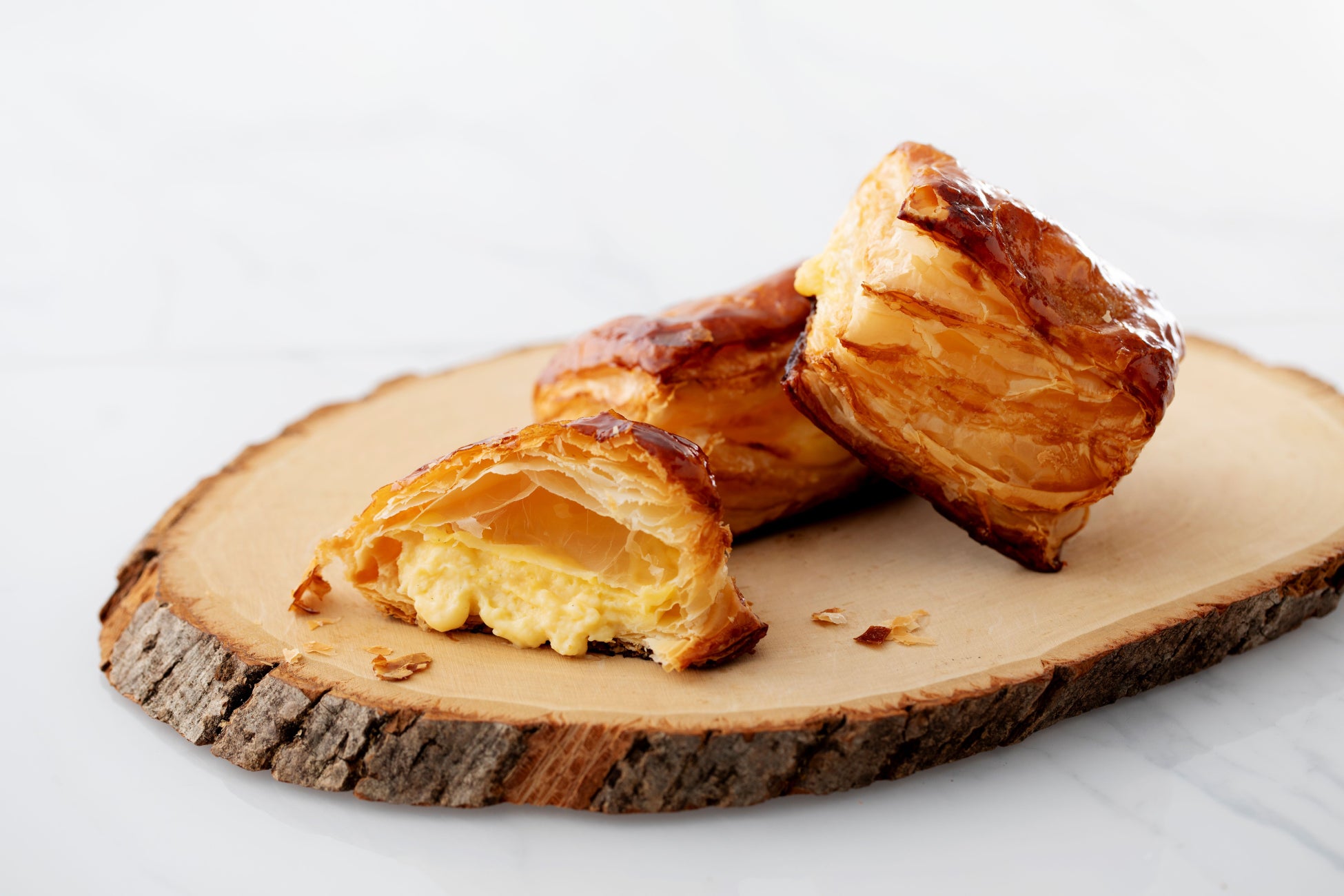 バターがふんわりと香るサクサクのパイ生地に、オーム牛乳を使用したバニラビーンズ入りのカスタードクリームを詰めました。濃厚な卵のコクと、九州産のミルクの豊かな香りと甘みがお楽しみいただけます。パイ生地の表面にまとわせたキャラメリーゼしたシュガーの香ばしさが、パイ生地とクリーム、それぞれの風味を引き立てます。