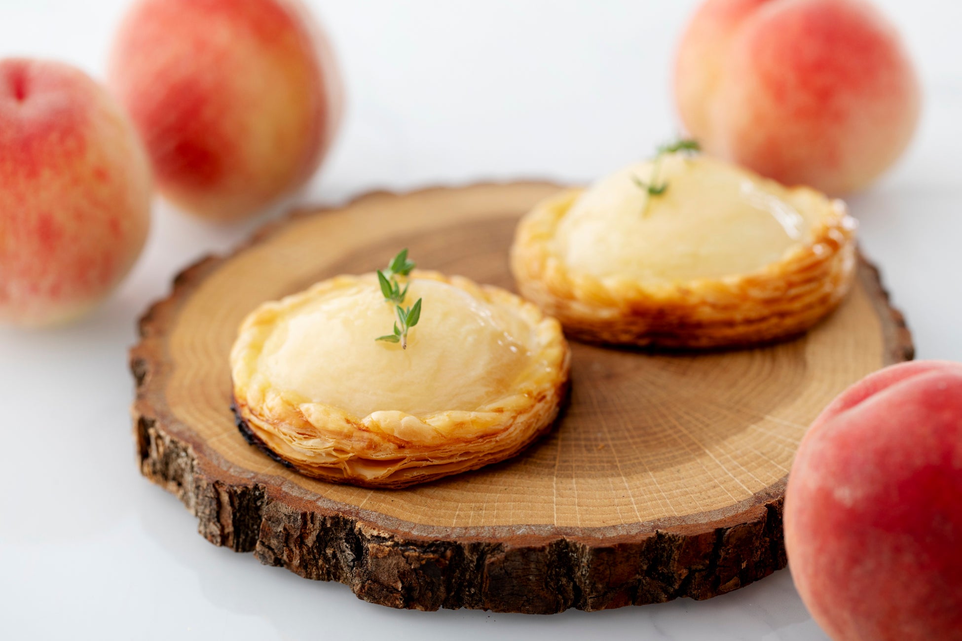 バターが豊かに香るパイ生地にパニラビーンズを合わせたカスタードを詰め、半分にカットした福岡県産の桃をのせて焼き上げました。甘く芳醇な桃と濃厚なカスタードの組み合わせをお楽しみください。