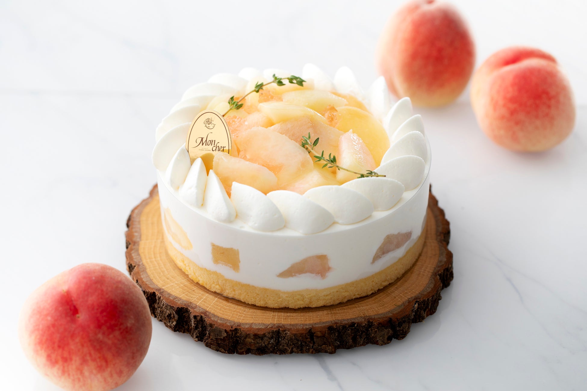 旬を迎えた福岡県産(糸島・八女)の桃をぜいたくに飾ったアニバーサリーケーキ