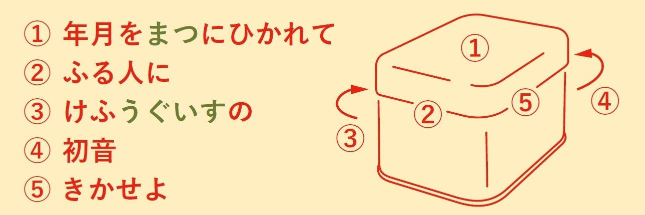 千年にわたって読み継がれてきた紫式部の著書『源氏物語』に登場する明石の君が、離れて暮らす幼い娘を想い贈った和歌「年月を 松にひかれて ふる人に 今日鶯の 初音きかせよ」が、「初音の調度」のデザインモチーフです。