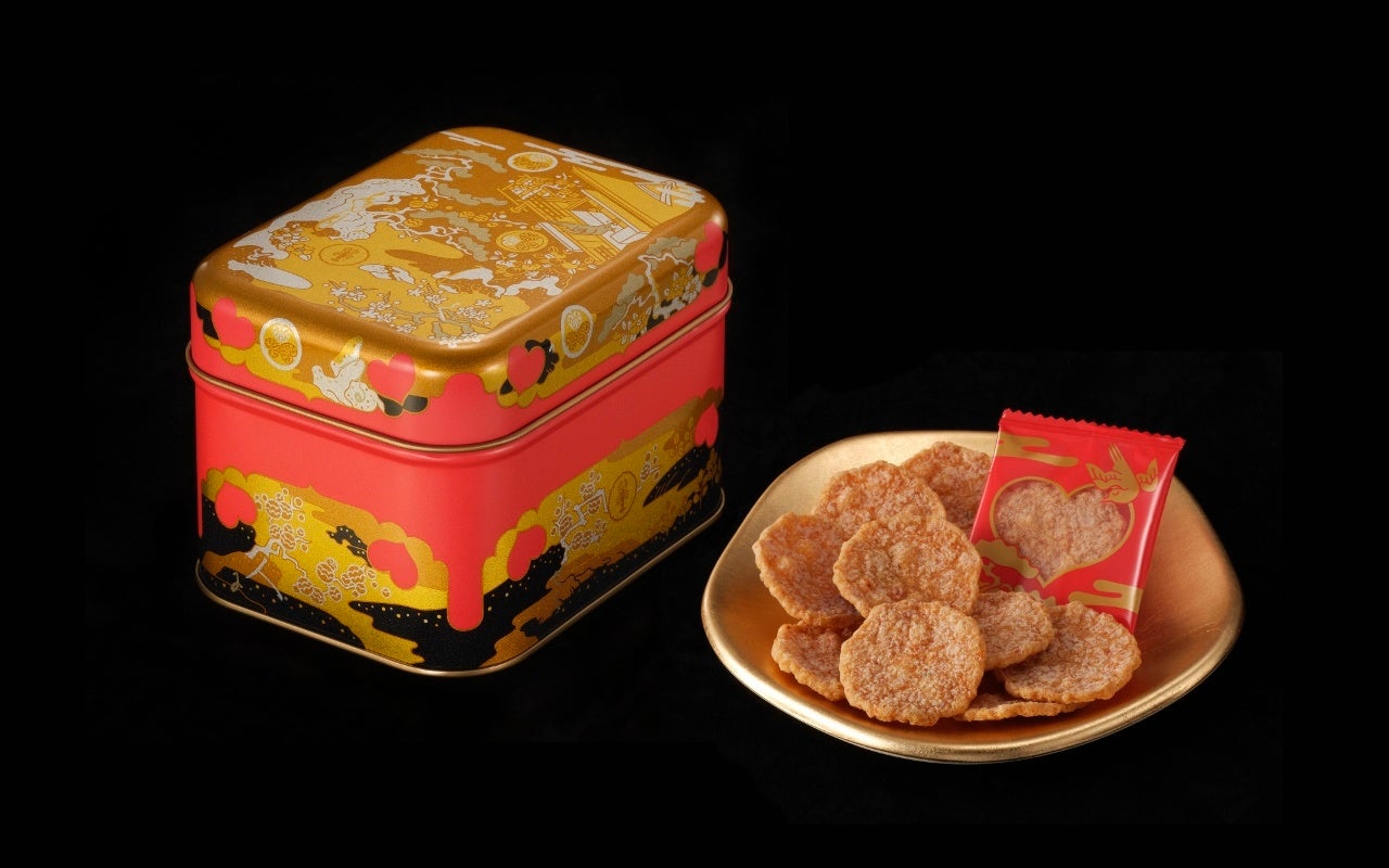 そして角次郎による「生せんべい」の開発から135周年を迎えた本年、千代姫が生涯大切にした「初音の調度」の小箱をデザインした缶の中に、夫である光友公が愛した「えびはんぺい」をルーツに持つ海老せんべいを詰めた商品が誕生したのです。