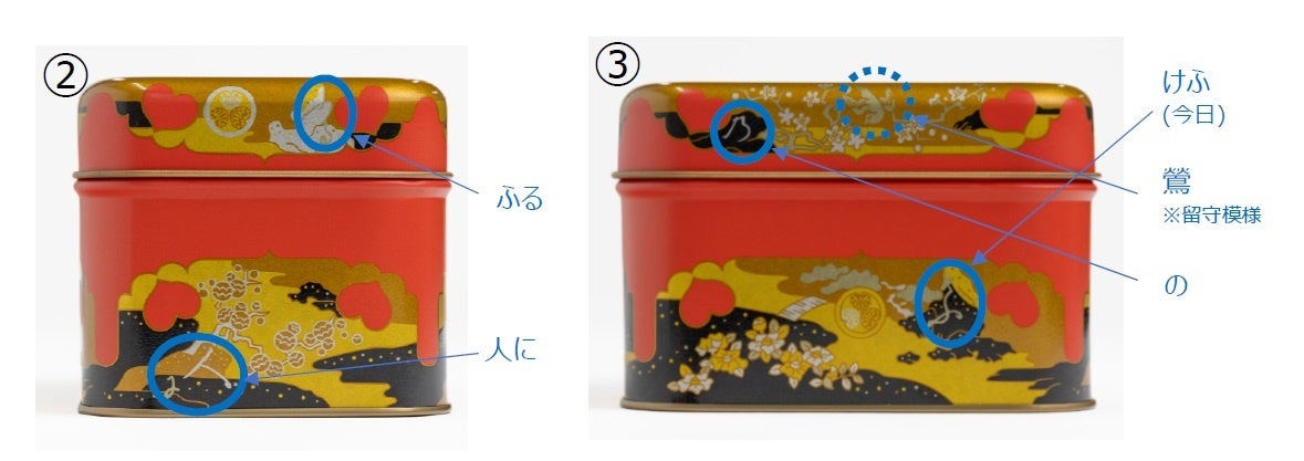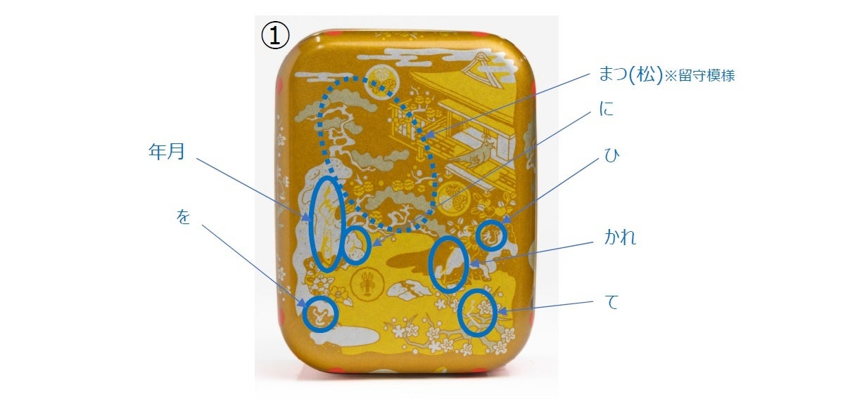 「初音の調度」のデザインには、和歌の言葉が葦手文字(※1)や留守模様(※2)で、絵の中に表現されています。〈姫ゆかり 初音の調度〉も、本物の「初音の調度」と同じ位置に和歌を隠しました。