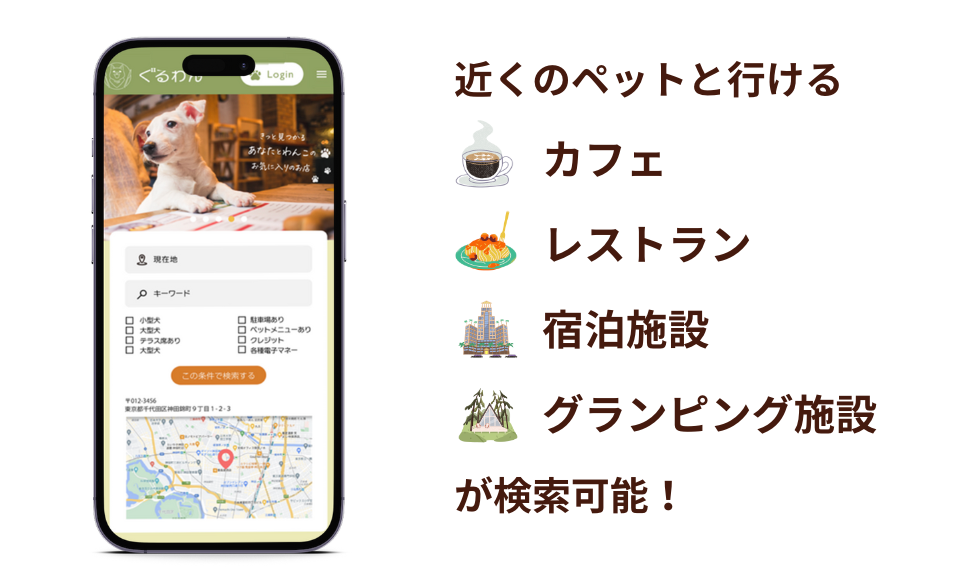 近くのペットと行けるお店を検索できるだけではなく、お店のペットに関する情報(ペット同伴可能範囲やドッグメニューの有無、ペット用設備の有無など)を事前に確認できるため、ペットとのお出かけ時の不安を解消します。