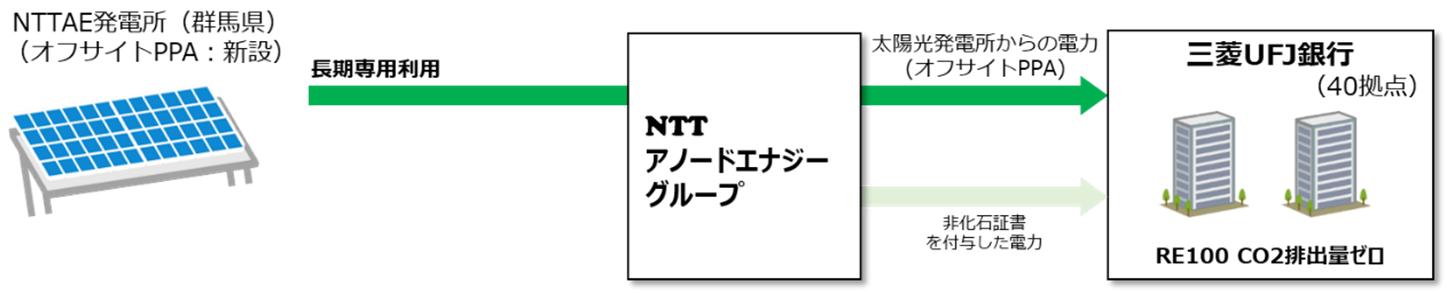 株式会社三菱UFJフィナンシャル・グループ(以下、MUFG)の連結子会社である株式会社三菱UFJ銀行は、今般、NTTアノードエナジー株式会社(以下 NTT-AE)と、新設太陽光発電設備を活用したオフサイトPPA[1]サービスに関する契約を締結。2022年7月に、東日本40拠点に対し、太陽光発電所で発電した再生可能エネルギー由来の電力導入を開始しました!また、同年3月には、東京電力エナジーパートナー株式会社の100%子会社である日本ファシリティ・ソリューション株式会社と、国内初の取り組みとして新設太陽光発電設備を活用したオフサイト自己託送エネルギーサービス[2]に関する契約も締結、9月より稼働しており、再エネ導⼊を加速させています。