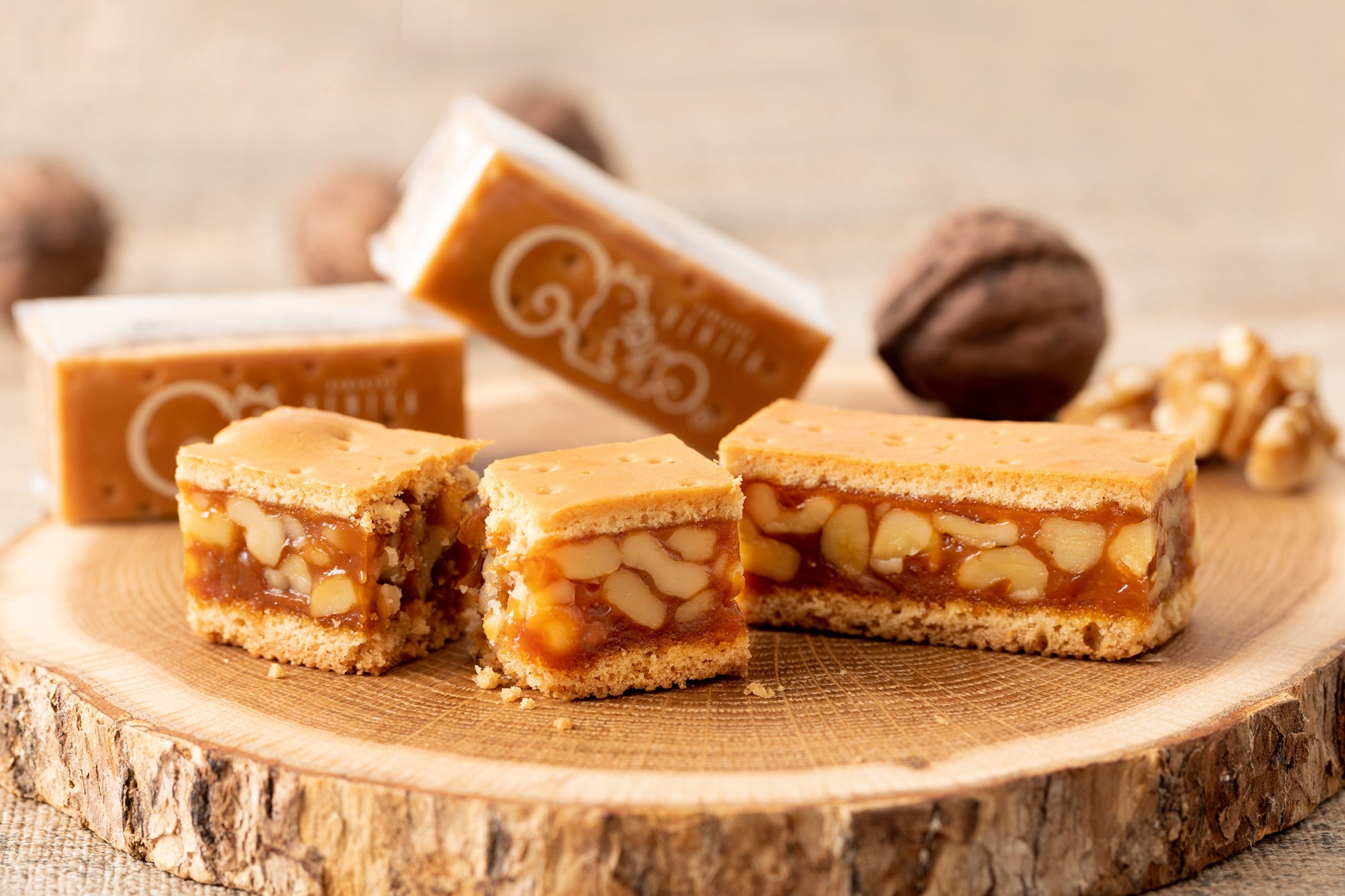 約40年前に誕生した代表商品の「クルミッ子」は、自家製キャラメルとクルミをバター生地ではさんだ焼菓子です。創業当時から続くロングセラー商品のサブレ「鎌倉だより(プレーン)」を型抜きした際に余った生地を活かそうと、スイスの伝統菓子エンガディナーをヒントに生まれました。