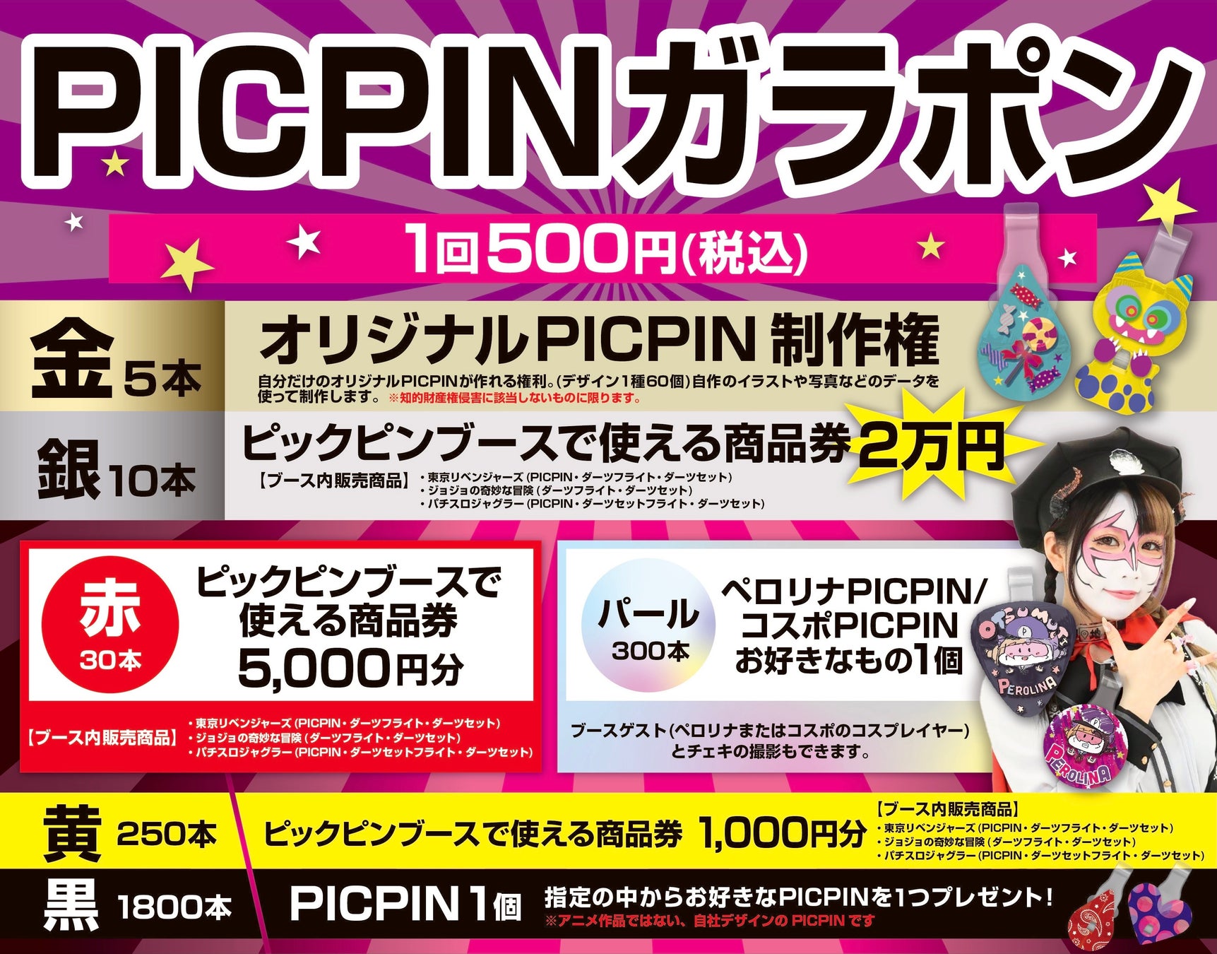 景品にはペロリナ氏直筆イラストのPICPINや、COSPOオリジナルPICPINのほか、お好きなゲストと一緒にチェキ撮影ができる権利に加え、ブース内の販売商品全てにお使いいただける商品券(2万円分)などの超豪華なラインナップをご用意しました。