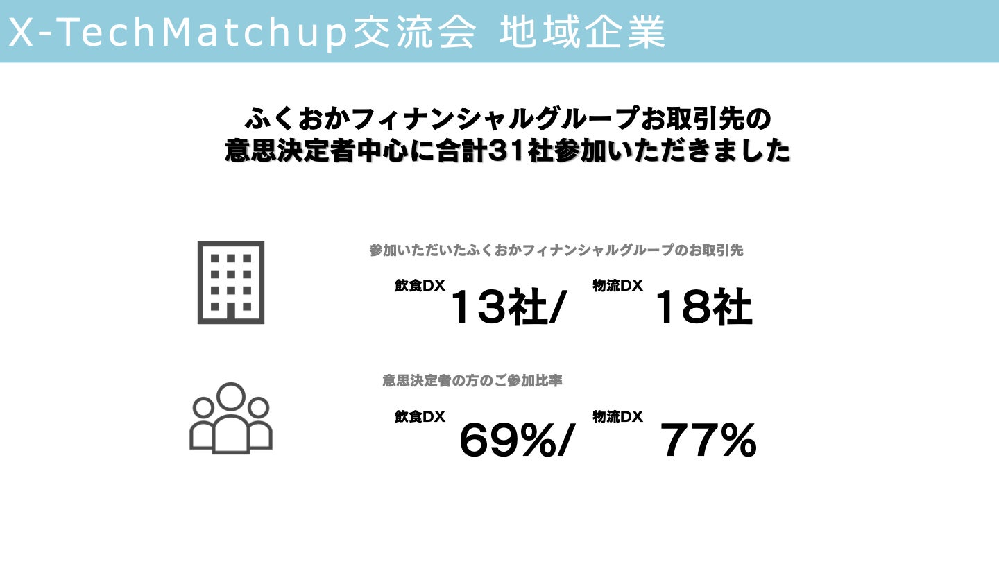 株式会社ふくおかフィナンシャルグループ(取締役社長 五島 久、以下「ふくおかフィナンシャルグループ」) 傘下の株式会社FFGベンチャービジネスパートナーズ(代表取締役社⻑ 吉田 泰彦、以下「FVP」)は、スタートアップと地域企業のネットワーキングイベント『 X-Tech Match up(クロステックマッチアップ) 交流会 飲食DX&物流DX』を開催致しました。
