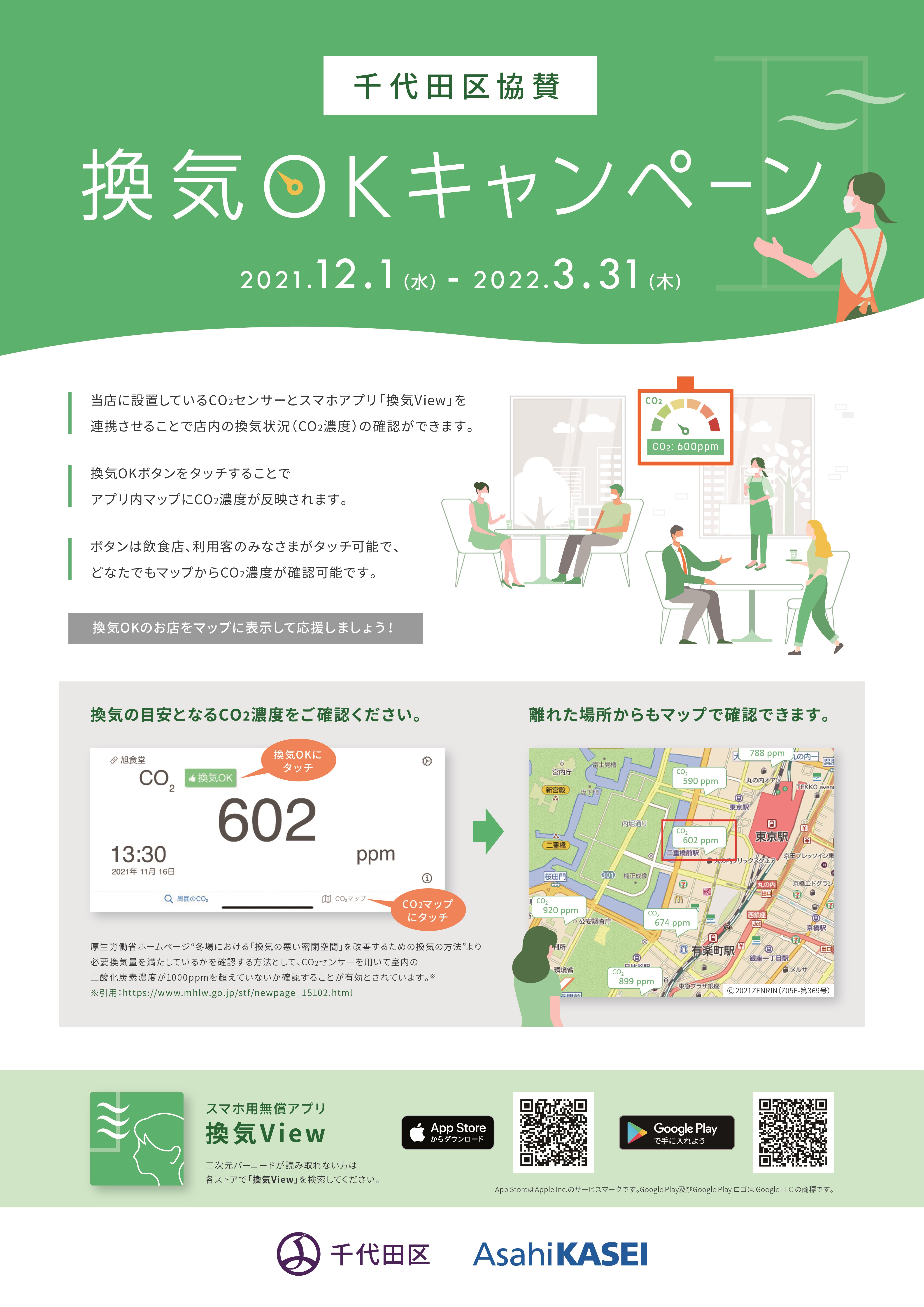 旭化成株式会社(本社:東京都千代田区、社長:小堀 秀毅、以下「当社」)は、東京都千代田区(以下「千代田区」)と換気による新型コロナウイルス感染症拡大防止に関する連携協定を12月15日に締結します。千代田区独自の取り組みである「千代田区新しい日常店」で設置したCO2センサーを活用し、認証店の換気管理を推進することにより、新型コロナウイルス感染症の感染拡大防止を目指します。連携協定の締結に伴い、千代田区が認証店へ配布したCO2センサーを活用しCO2濃度1,000ppm以下の換気管理が行われている店舗の情報を広く一般に向けて発信することで集客を支援する「換気OKキャンペーン」(以下「本キャンペーン」)を実施します。