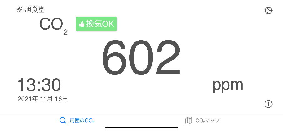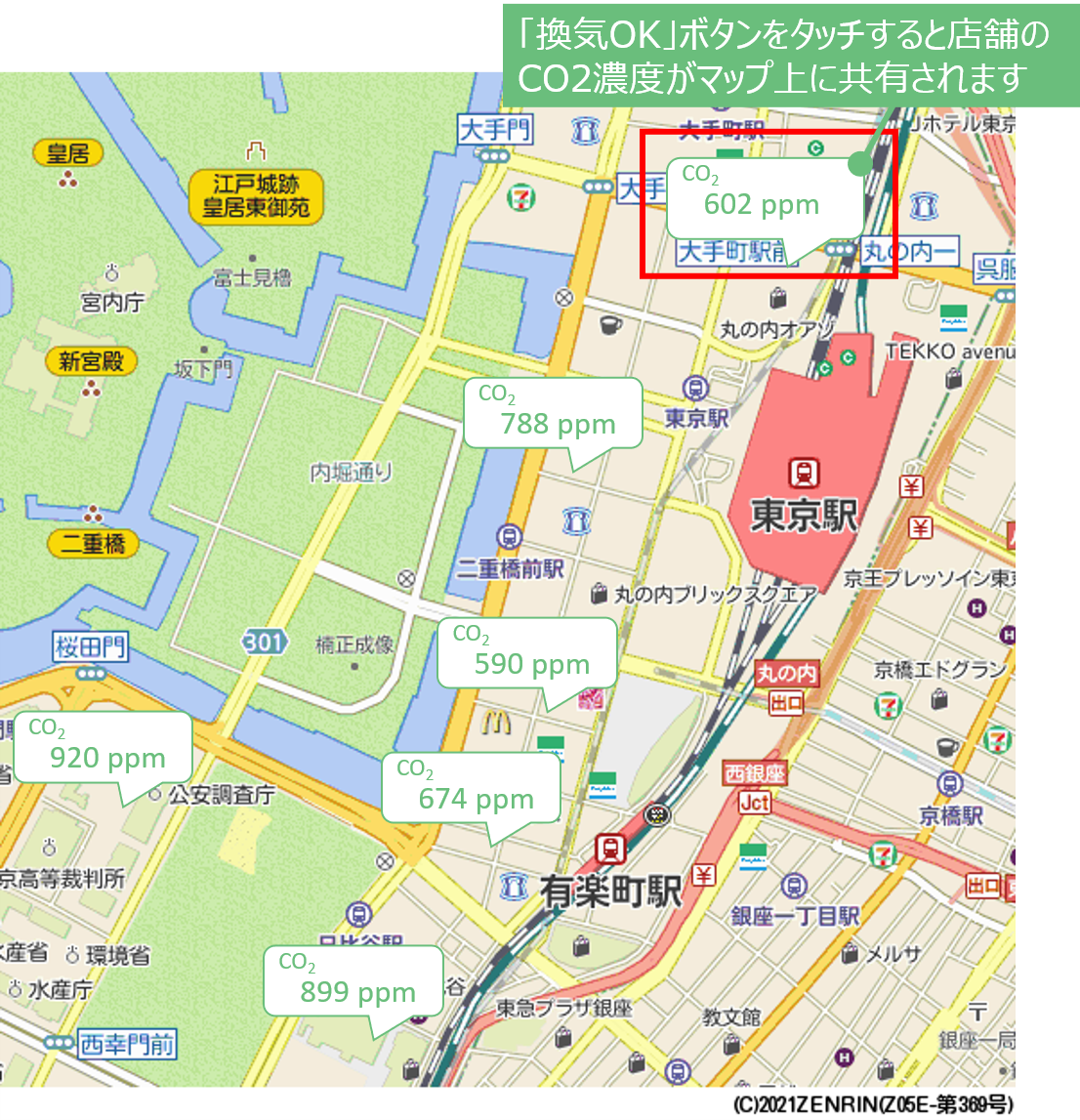 さらにCO2濃度が1,000ppm以下の場合のみ画面に表示される換気OKボタンをタッチすることで店舗の換気情報をアプリ内のCO2マップに共有することができ、店舗がしっかり換気管理を行っていることを確認可能です。