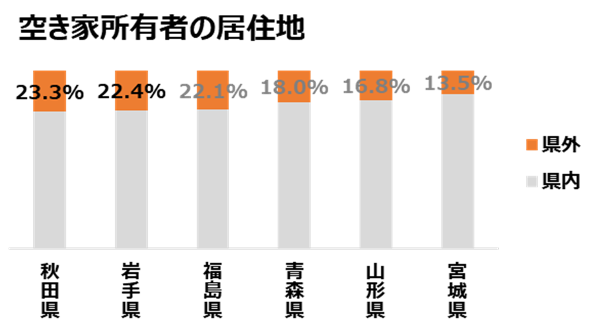 東北地方の空き家のうち、所有者が県外に居住している割合が1番高いのは秋田県で、2番目に岩手県で5人に1人以上の割合です存在します*³。