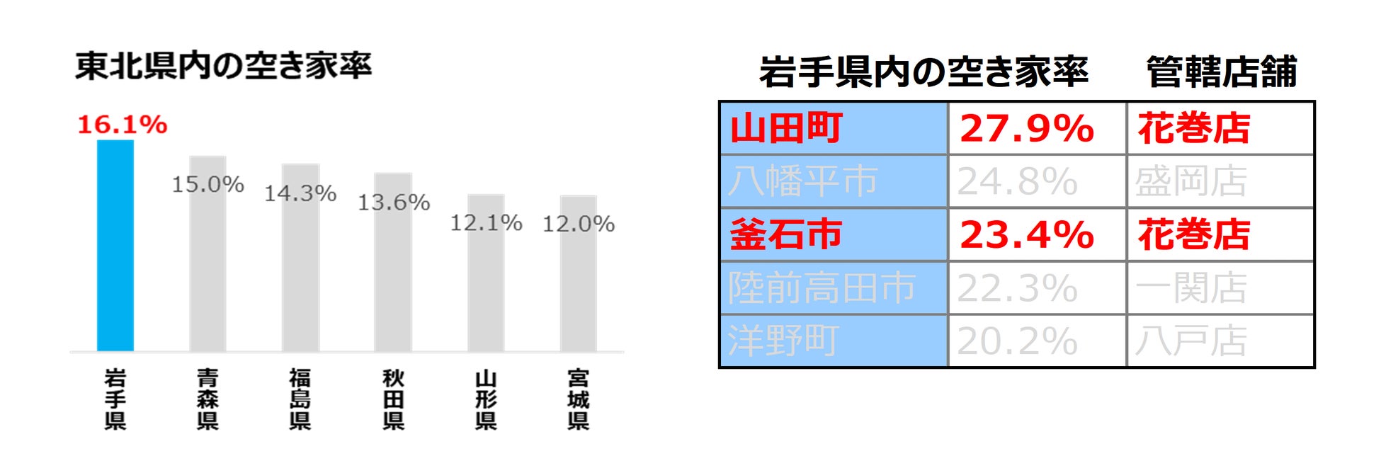 今回新店舗を構える岩手県は、東北地方の中で最も空き家率が高く6軒に1軒が空き家の割合です*²。そして新店舗では花巻市を中心に、岩手県内で空き家率の最も高い山田町や、3番目に高い釜石市も管轄します*²。