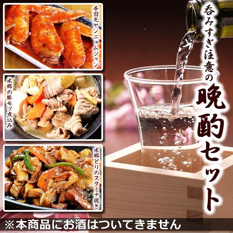 お酒がすすむ!豚もつ煮込み・手羽先ヤンニョムジャン・鶏スタミナ焼きが入った、お酒にピッタリの極上おつまみセットです。