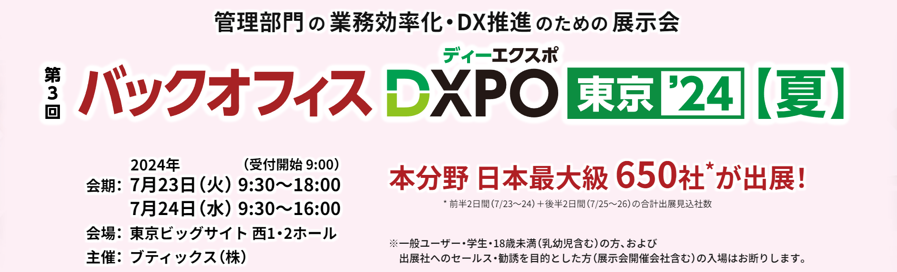 7/23(火)・7/24(水)に東京ビッグサイトでブティックス株式会社主催の「バックオフィスDXPO東京24夏」が開催され、期間中に行う専門セミナーに弊社鶴野が登壇します。