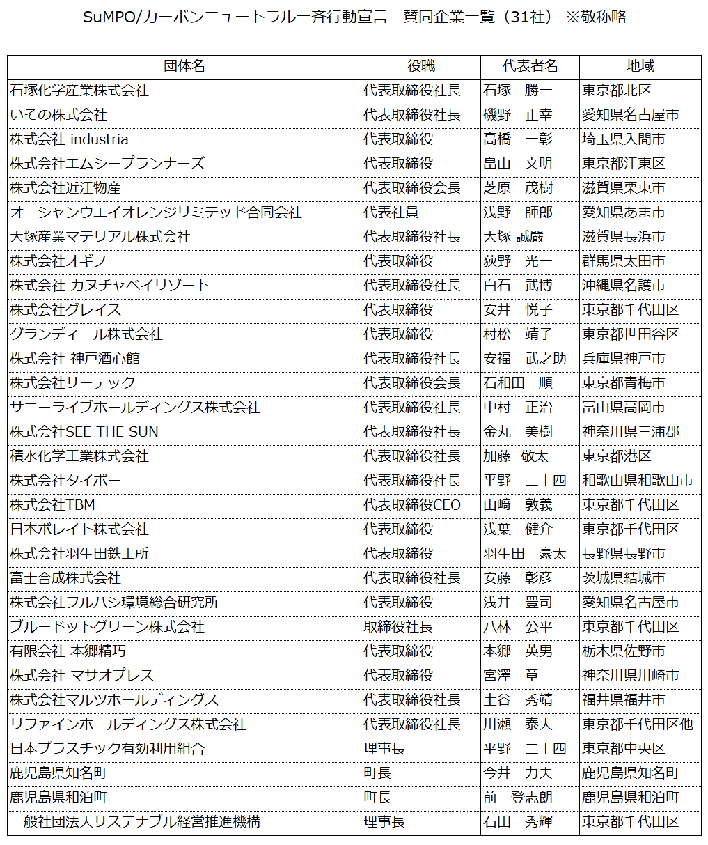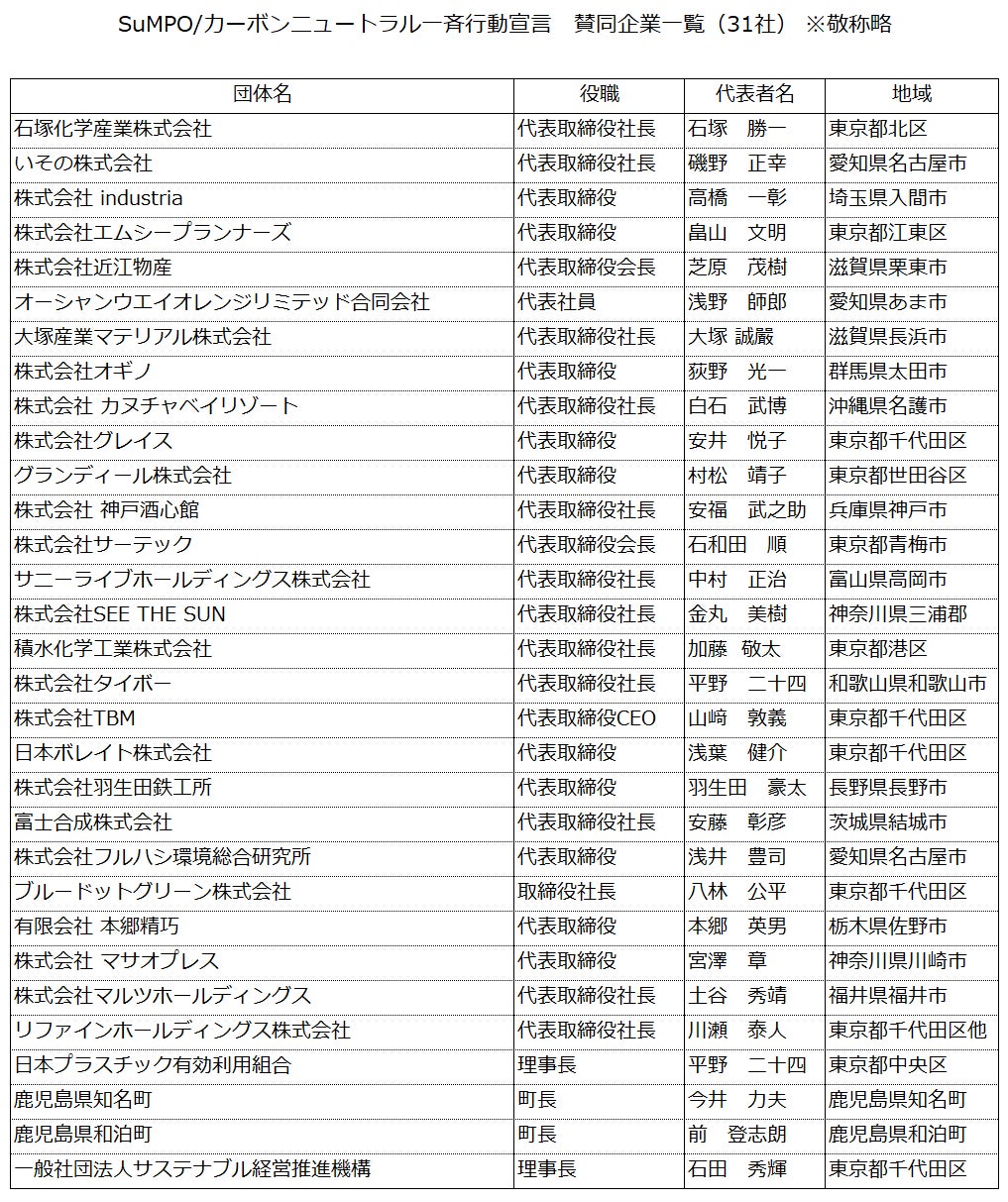 今般、本「SuMPO/カーボンニュートラル宣言一斉行動」をもとに、会員企業を対象に賛同企業を募集したところ、以下の31社から賛同を得ました。