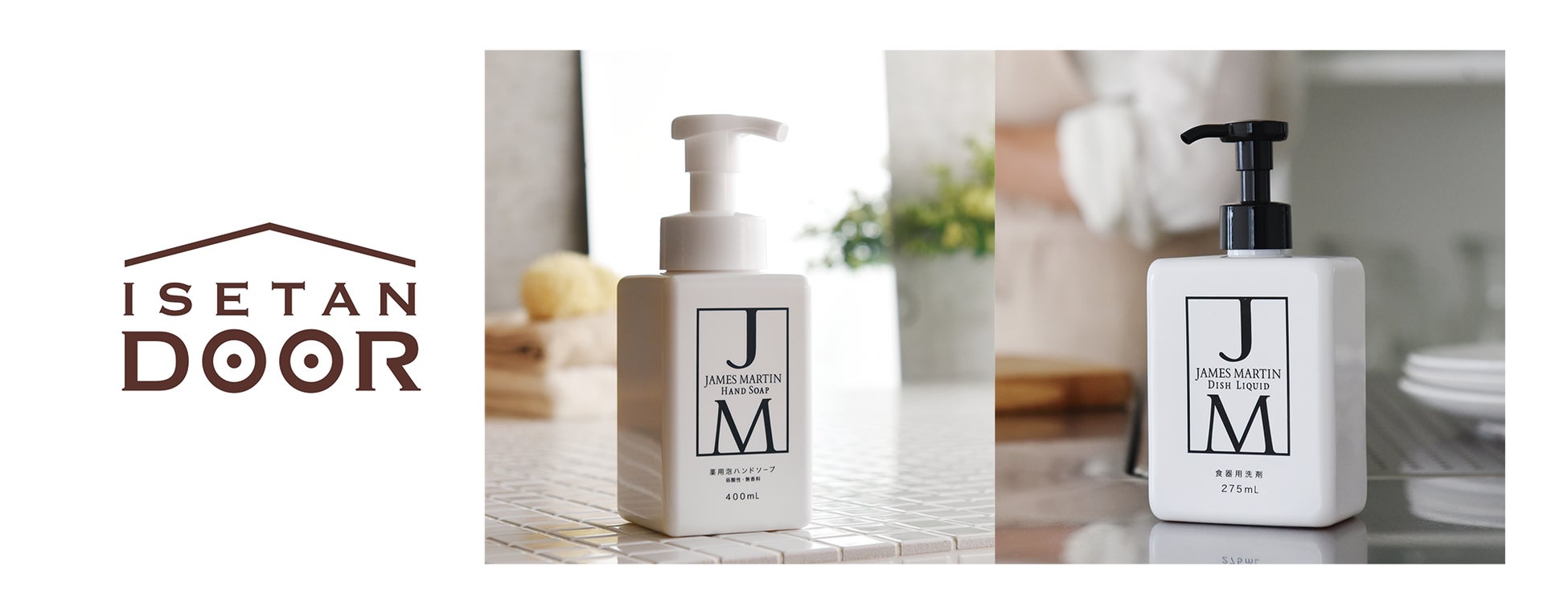 ISETAN DOORでは、手肌に優しくさっと洗い流せる泡切れのよい「薬用泡ハンドソープ」の400mlと詰め替え用350ml、泡もちの良さと優れた洗浄力、手肌へのやさしさが特徴の食器用洗剤「ディッシュリキッド」の275mlと詰め替え用500ml販売致します。 ISETAN DOORでしか購入できないこだわりの食料品やミールキット、自分へのご褒美スイーツなどと一緒に、日々の生活に欠かせないジェームズマーティンのハンドソープや食器用洗剤をより気軽にご購入いただけます。