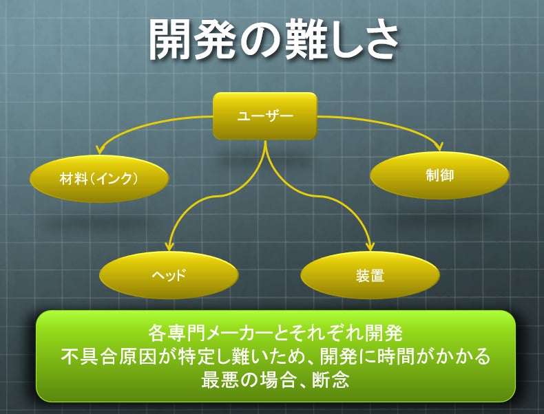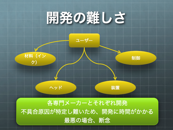 当社が窓口となり、インクやヘッド、装置、制御などの各専門メーカーと開発を進めることで、開発までのリードタイム短縮や開発断念へのリスクヘッジに繋がります。