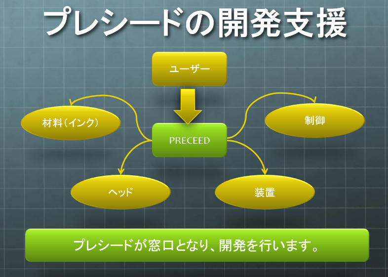 株式会社プレシードは、産業用インクジェットの導入によって、自社開発リードタイムの短縮や在庫のミニマム化、材料ロスの削減(環境負荷改善)などを実現したいお客様に最適なソリューションをご提案いたします。