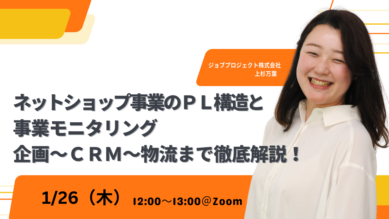 ハタラクをつくる、楽にする、楽しむソリューションを提供するジョブプロジェクト株式会社(本社:東京都新宿区、代表取締役:鈴木 貴大 https://job-project.com/ 以下、ジョブプロ)は、この度、「ネットショップ事業のPL構造と事業モニタリング」と題し、EC事業の一般的なPL構造から、事業を伸ばしていく際のKPI設計まで事例をもとに解説するセミナーを2023年1月26日(木)12:00~開催いたします。