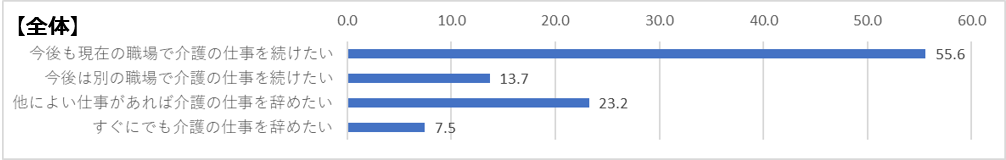 現役介護士の半数以上(55.6%)が「今後も現在の職場で介護の仕事を続けたい」と回答。「今後は別の職場で介護の仕事を続けたい」を加えると、現役介護士の約7割(69.3%)が今後も介護の仕事を続けたいと考えている。