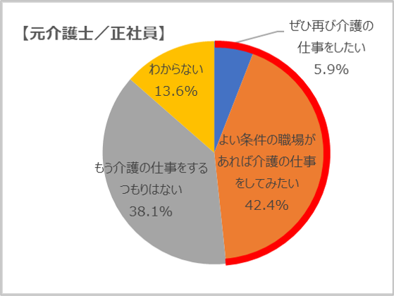 介護の仕事を離れた元介護士に再び介護の仕事をしたいかを尋ねたところ、正社員として働いていた元介護士では、「ぜひ再び介護の仕事をしたい」(5.9%)と「よい条件の職場があれば介護の仕事をしてみたい」(42.4%)の合算が48.3%となり、約5割に介護職へのカムバックの意向があることがわかりました。