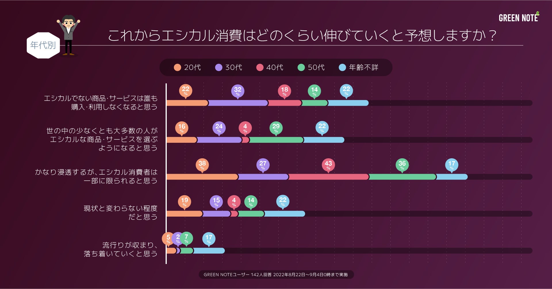 Greenroom株式会社(本社:東京都新宿区、代表取締役:山崎 修平)が運営するサステナビリティ / SDGs専門ニュースアプリ『GREEN NOTE(グリーンノート)』は、SDGsやサステナブルに関する意識を明らかにすることを目的に、サステナビリティに感度の高いアプリユーザー20~50代以上の142名を対象に「これからエシカル消費はどのくらい伸びていくと予想するか」についての市場調査を実施。