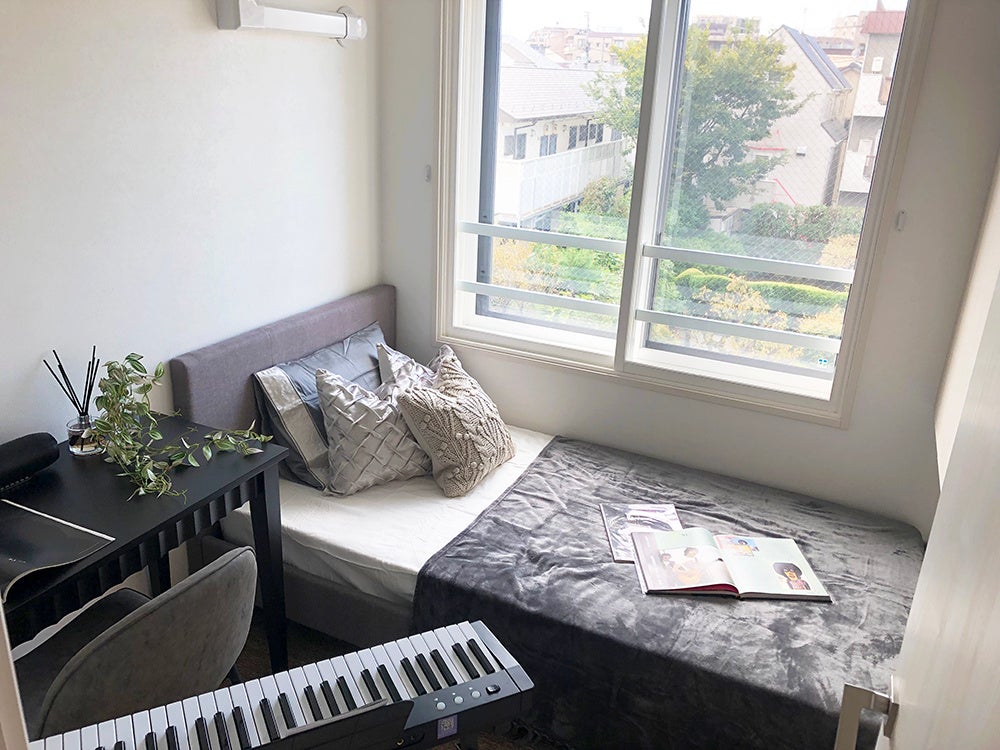 防音室の3重サッシが、室内の音を外部に向けて緩和するだけでなく外部からの騒音もやわらげ、寝室としての環境も向上。
