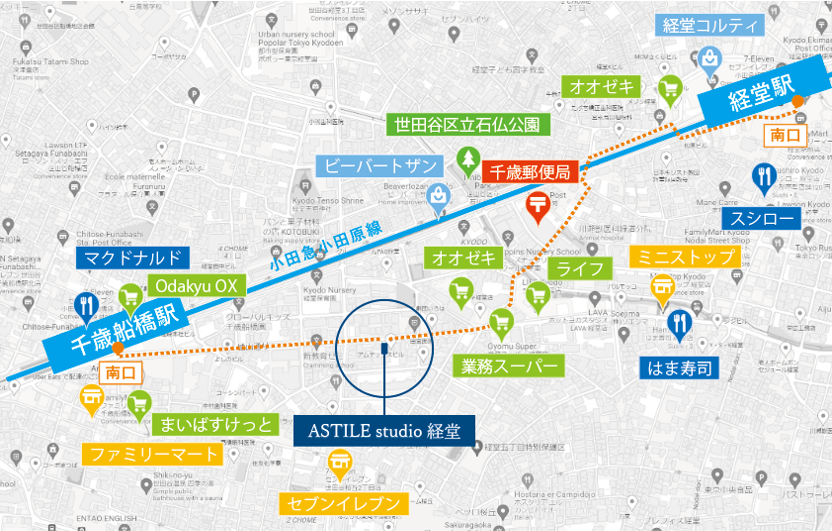 小田急小田原線「千歳船橋」駅徒歩7分、「経堂」駅徒歩11分、緑豊かな住宅街に位置しています。新宿直結の小田急小田原線経由で、都心の主要駅へも快適な電車アクセス。