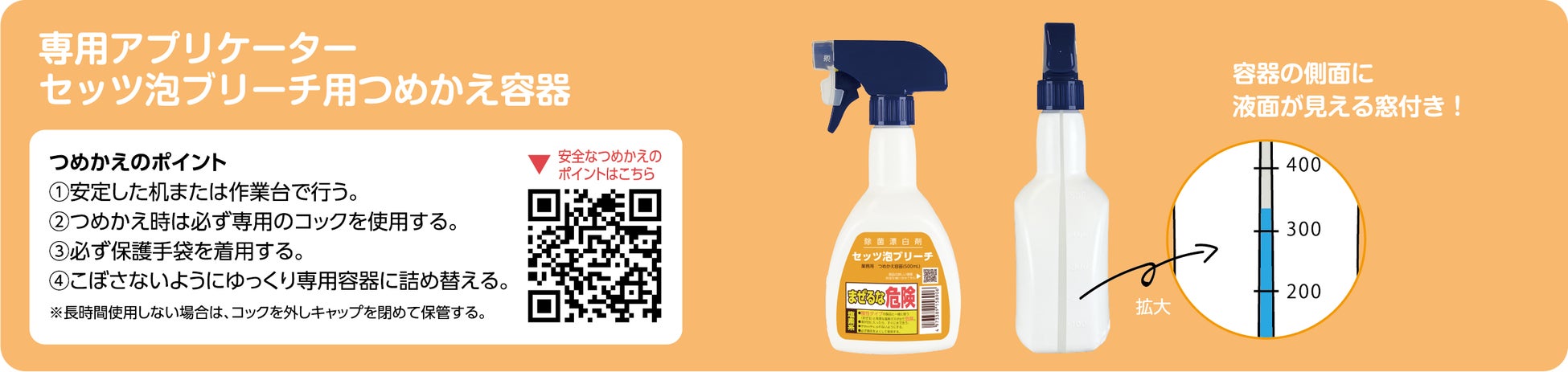 また、泡スプレーで使用する場合は、詰替え時や使用時の安全性を考慮したセッツ泡ブリーチ用つめかえ容器をご使用ください。