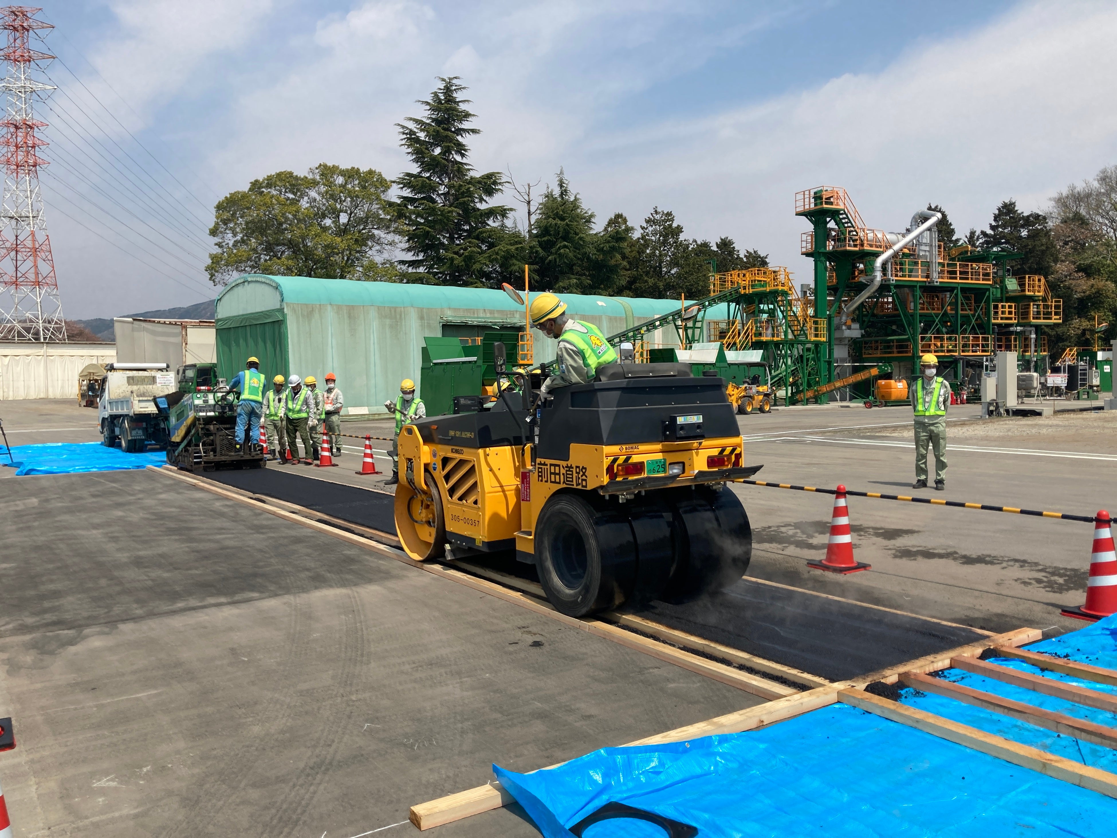 前田道路 技術研究所の試験プラントに500kWの水素バーナを設置し、アスファルト混合物の製造と、場内にて試験施工を行いました。