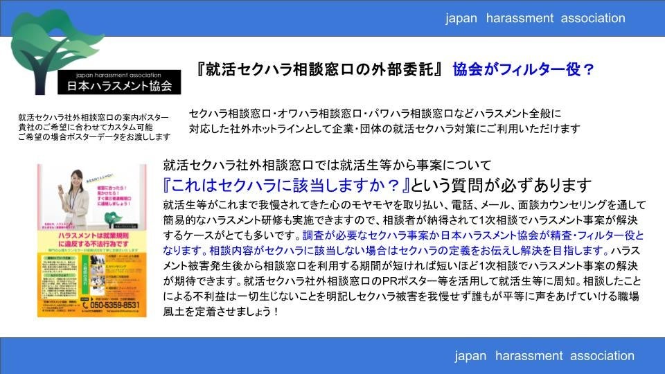 ハラスメント専門家として企業のハラスメント対策を支援する一般社団法人日本ハラスメント協会(本部事務局:大阪市西区、代表理事:村嵜要)は2026年10月から企業等に対策が義務化される就活生等へのセクハラ対策に対応できる企業・団体向け「就活セクハラ相談窓口」「就活セクハラ調査」の外部委託サービスを同時リリースいたします。