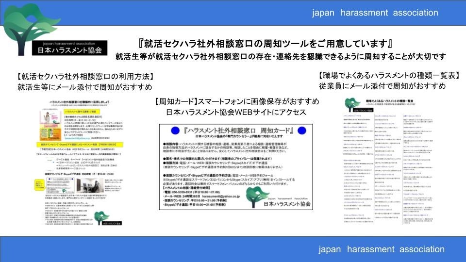 日本ハラスメント協会は社会貢献活動の一環として全国の学生が無料で相談できる『就活ハラスメント無料相談ホットライン』を日本で初めて設置しました。