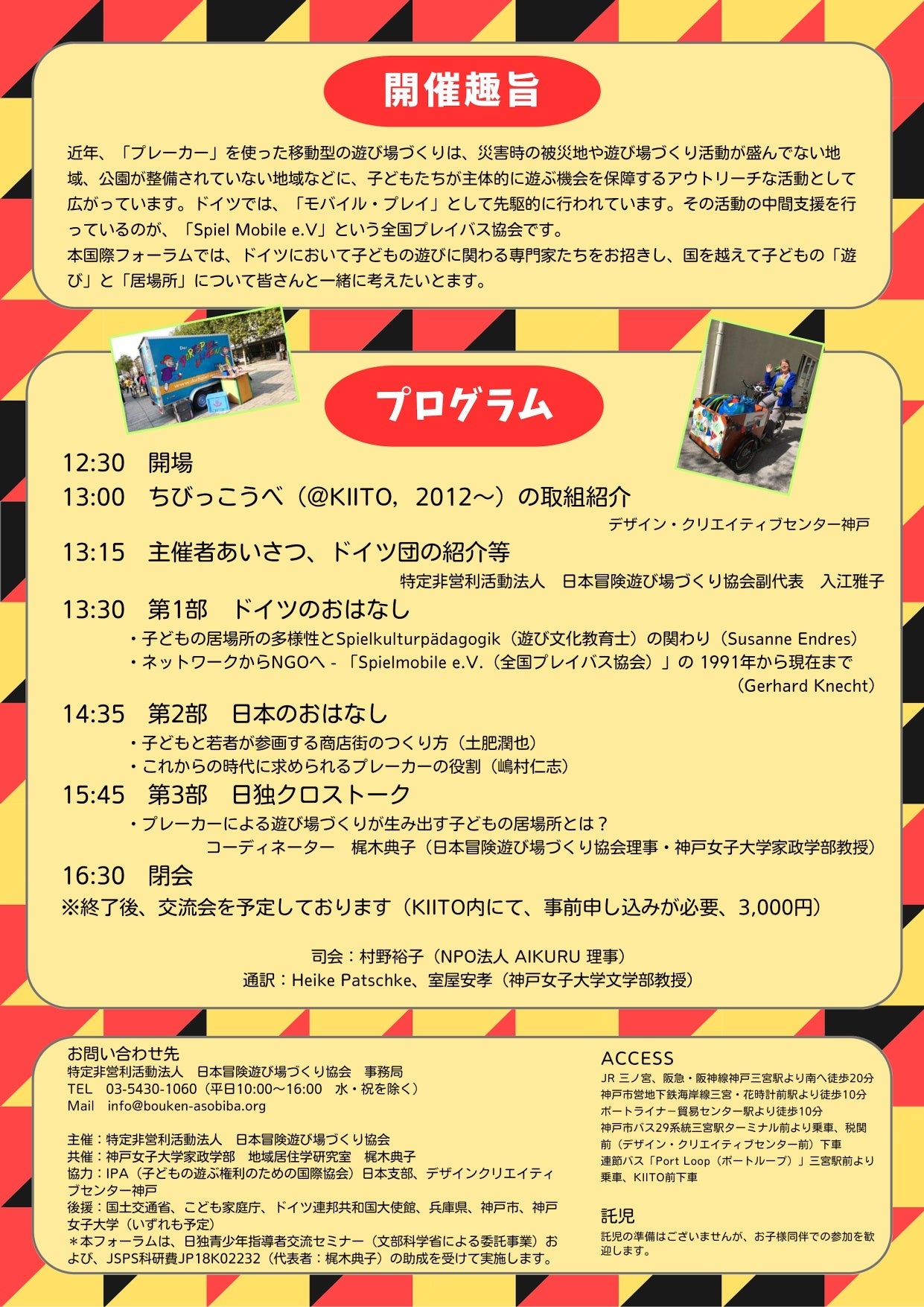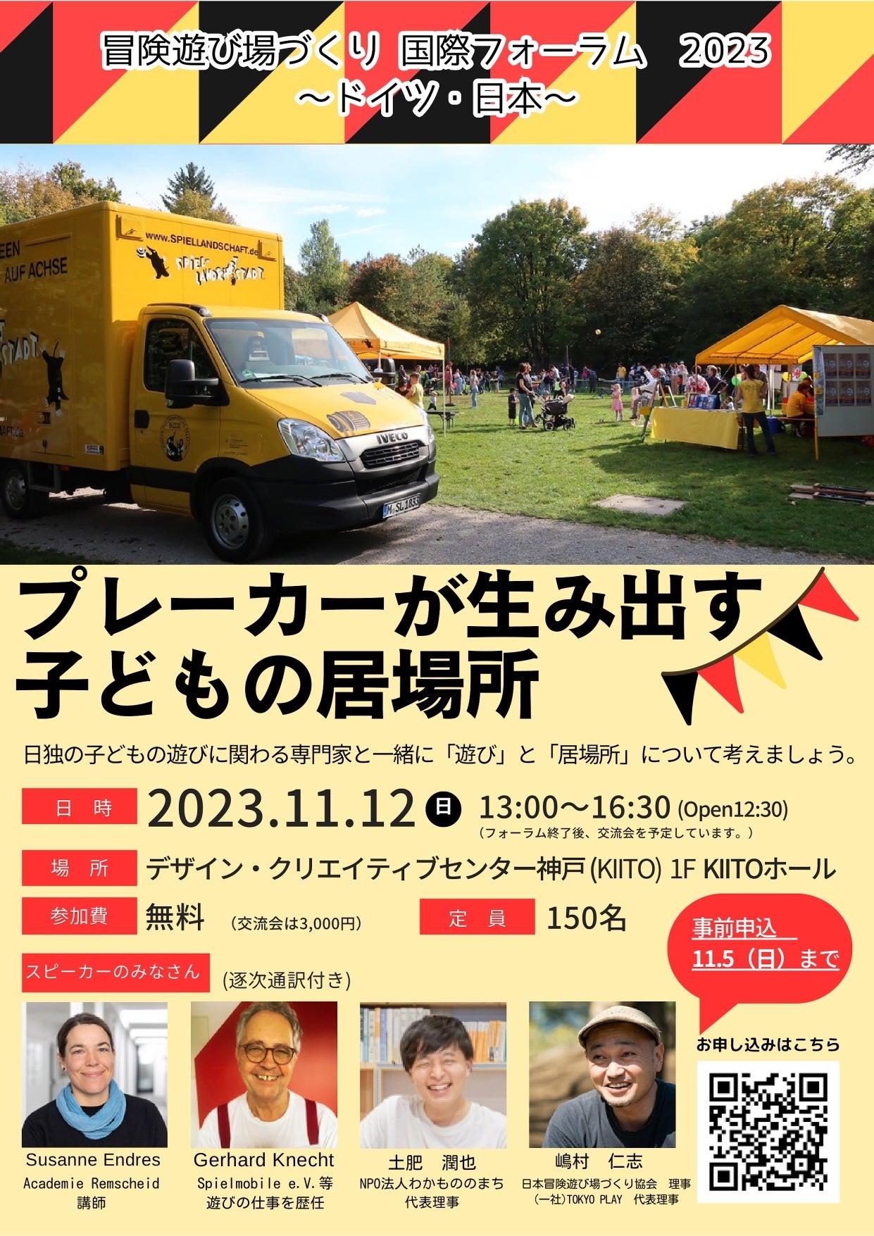 【11月12日 開催】冒険遊び場づくり国際フォーラム2023「プレーカーが生み出す子どもの居場所」~ドイツ・日本~ のご案内<神戸女子大学>