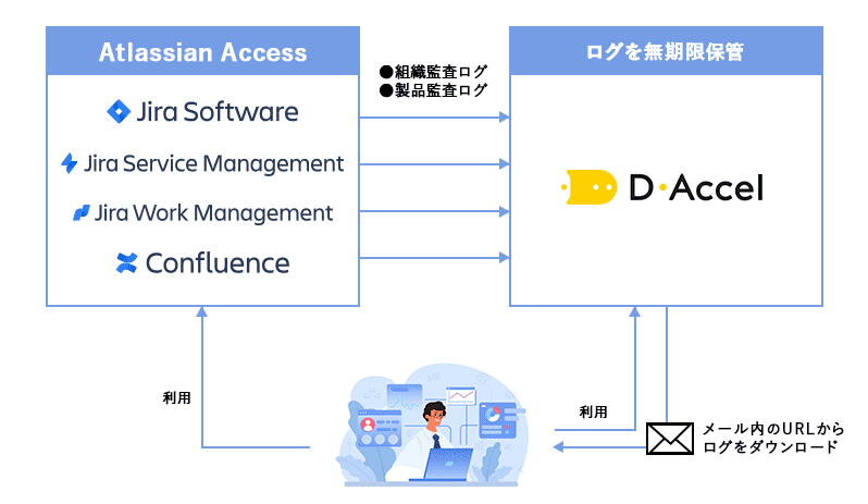 アトラシアン社のJira製品、ConfluenceのログをD-Accelに無期限で保管します。各対象製品にD-Accelのアプリをインストールし設定することで、どなたでもご利用可能です。