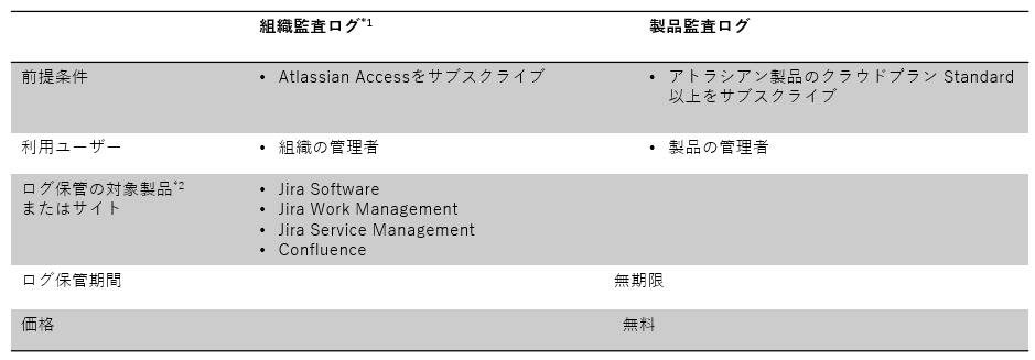 *1アトラシアン製品のクラウドプランEnterpriseをサブスクライブしている場合、組織監査ログにユーザーアクティビティも含まれます