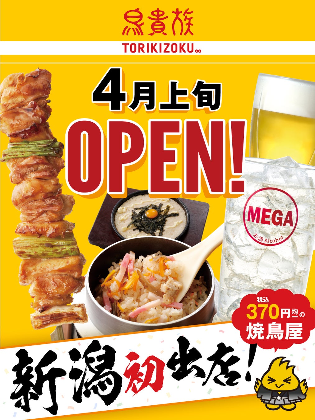 株式会社エターナルホスピタリティグループ傘下の株式会社鳥貴族(本社:大阪市中央区 代表取締役社長:江野澤暢男)が運営する税込370円均一の焼鳥屋「鳥貴族」は、新潟県で初出店となる、新潟駅南店(運営元:株式会社縁)を出店することをお知らせいたします。なお、オープン時期は2025年4月上旬を予定しています。