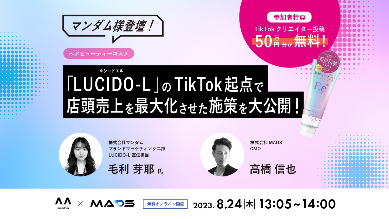 【無料ウェビナー開催のお知らせ】8/24(木)13:05~14:00 | マンダム様登壇!「LUCIDO-L ルシードエル」の、TikTok起点で店頭売上の最大化に成功した施策を大公開!
