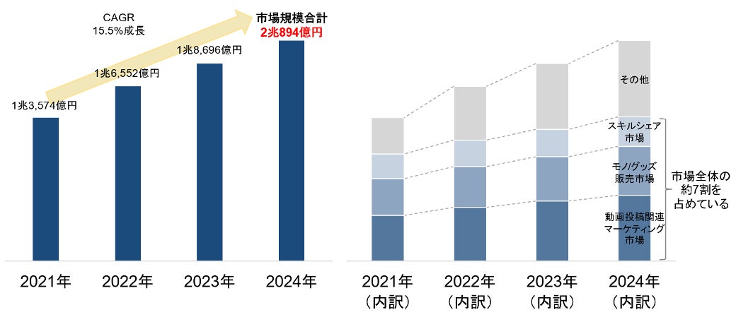 モノ/グッズ販売、動画投稿に関連した広告・マーケティング、スキルシェアなどが引き続き市場全体の約7割を占め、成長をけん引