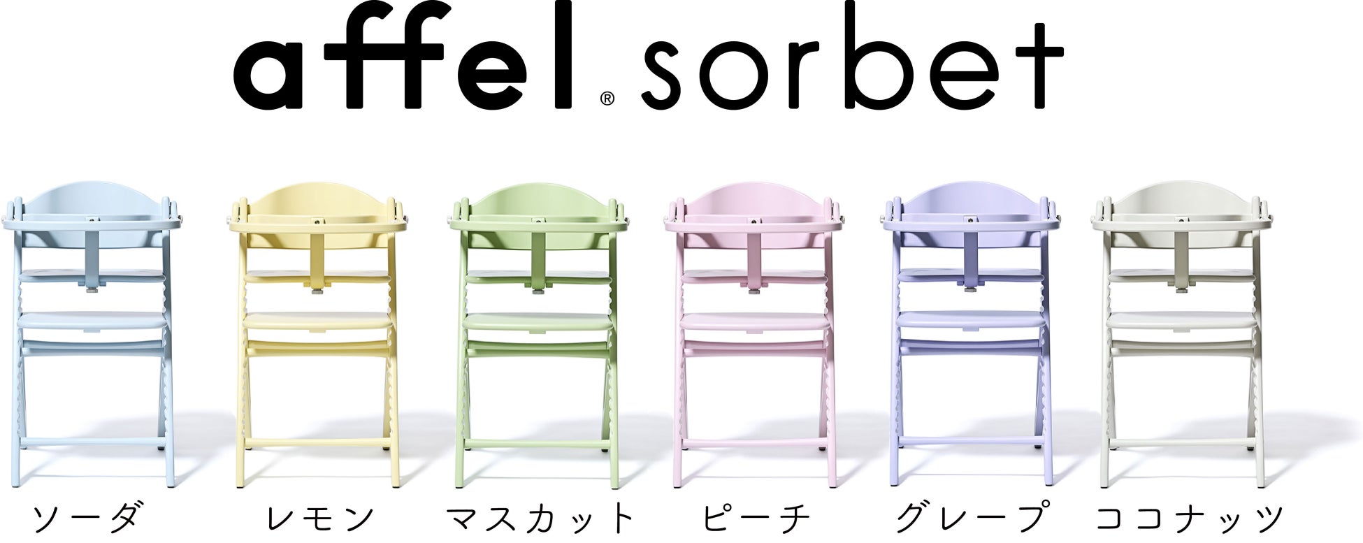 大和屋は2016年より「アッフルチェア」として、淡いパステルカラーが特長のベビーチェアを販売していました。この度、色合い・機能などアップデートし「アッフル ソルベ チェア」として発売いたします。