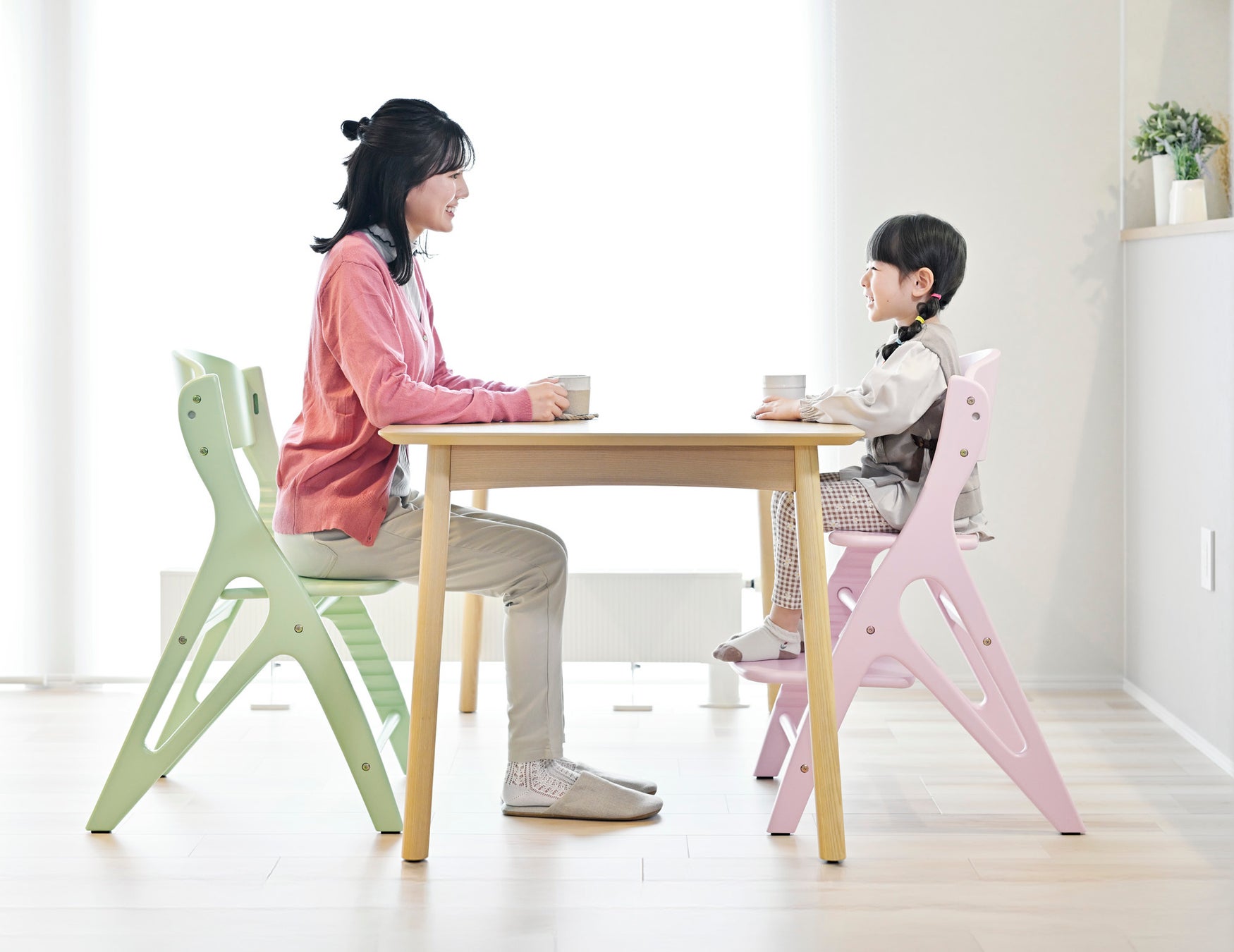 チェア全体の高さをアップさせ、テーブルは、床から約71cmの高さのダイニングテーブルの上に被せられるようになりました。それにより子どもと目線があわせやすい距離が保てます。