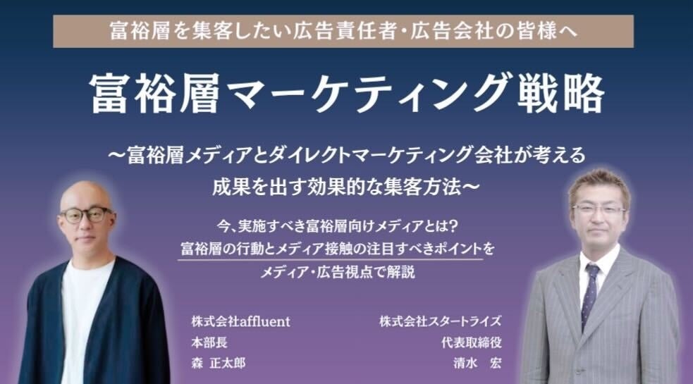 富裕層向けメディアを13年手がけている株式会社affluentと、創業15年目にて富裕層向け媒体に強い株式会社スタートライズが富裕層マーケティング戦略を語る!